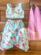 Blue printed harem pant with stole and top with gold lace detailing