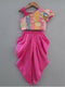 This dhoti pant set features a sequins fabric one shoulder top with a frilly strap and elasticated pink madras silk pants.