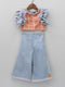 A playful grey organza palazzo features back elastic, perfectly matched with an orange printed ruffle top.