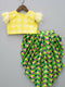 Yellow sequins hand embroidery top with pleats and feathers paired with green printed Dhoti pant With back elastic