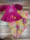 Introducing our Magenta Embroidered Peplum Printed Dhoti Set, a luxurious and exclusive outfit for kids. The exquisite magenta peplum top showcases pitta work birds embroidery and delicate pearls on the organza puff sleeve. Paired with a printed dhoti pant featuring an elastic waist and bright tassels, this set exudes elegance and sophistication. Elevate your child's style today.