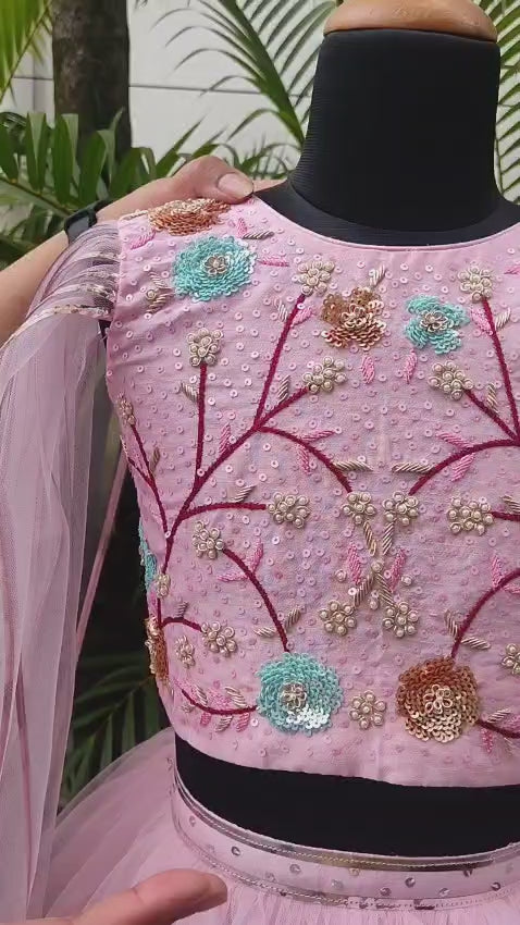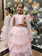 This Pink Layered Cape Lehenga for kids is a delightful blend of elegance and fun. Crafted from net and silk, it features a flowing cape adorned with metallic lace, adding a magical twinkle to every twirl. Beautiful thread and zari embroidery decorate the lehenga, while a stylish back design makes it uniquely charming. Perfect for little ones who love to sparkle and stand out at any celebration!