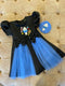 A fun knee length candy dress with double bow and beaded candy and toffee embroidery. Enhanced with contrast blue net and sequins and cute little puff sleeves to make your child look adorable.