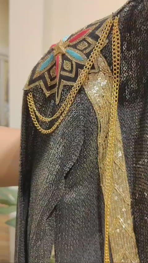 Let your little one shine like a K-pop superstar in this thrilling Demon Hunter-inspired outfit! Featuring a crisp white top with a convenient back zip and coordinating shorts, this ensemble is designed for comfort and style. The standout black sequins jacket sparkles with eye-catching hand embroidery details that'll have everyone mesmerized. Shimmering gold chain accents on the jacket and shorts add that extra dash of cool-factor magic. Ideal for theme birthday, dance performances, costume parties, or any occasion where your child wants to make a dazzling impression!
