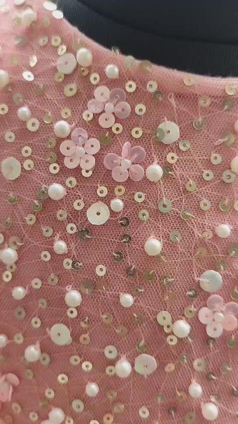 Heavy western knee length dress with sequins and pearls handwork on sleeves, front, back. There is feather and ruffles detailing and multi layers of net