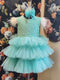 A gorgeous knee length layered dress in blue with full handwork of pearls and katdana on yoke and feather detailing on armhole.