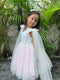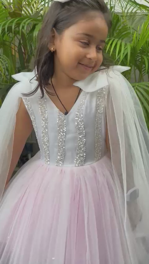 This enchanting knee-length frock is every little girl's dream! Featuring a stunning white and pink shaded gher design, it's adorned with delicate sequin embroidery on the yoke and shimmering pearls cascading along the hem. The show-stopping cape and bow details on the shoulders add a touch of magic, while an embroidered bow at the back completes the look. Perfect for special occasions, celebrations, or making everyday moments feel extra special!