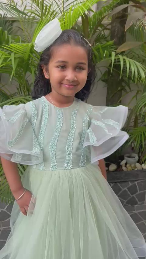 Twirl into elegance with this enchanting midi length light green gown that sparkles from every angle! Adorable circular sleeves feature the same dazzling sequin embroidery as the bodice, creating a perfectly coordinated look. The horsehair hem adds a delightful bounce to every movement, while the back bow—adorned with pearls and sequins—reveals a charming surprise. Perfect for special occasions, celebrations, or those moments when your little one deserves to feel absolutely magical.