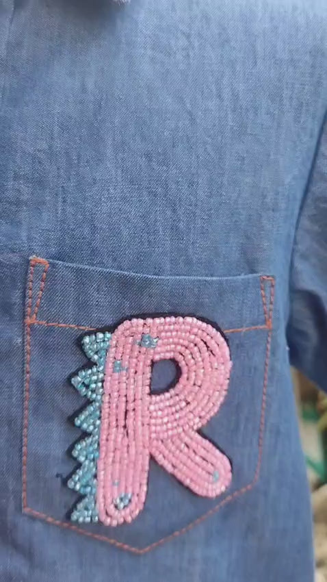 Roar into style with our Personalised Dino Denim Shirt! This half sleeve denim shirt features your child's initial and a colorful dinosaur motif. Perfect for unleashing their inner dinosaur while looking cool and unique. Rawr-fully fun for any occasion!