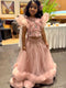 Add some whimsical charm to your wardrobe with our Pixie Lehenga! This pink lehenga set features a double ruffle net skirt for a playful touch. The hand embroidery, appliques, sequins, and feathers create a unique and eye-catching design. The organza sleeves with twisted details and sequin accents add extra flair, while the elasticated waistband ensures a comfortable fit.